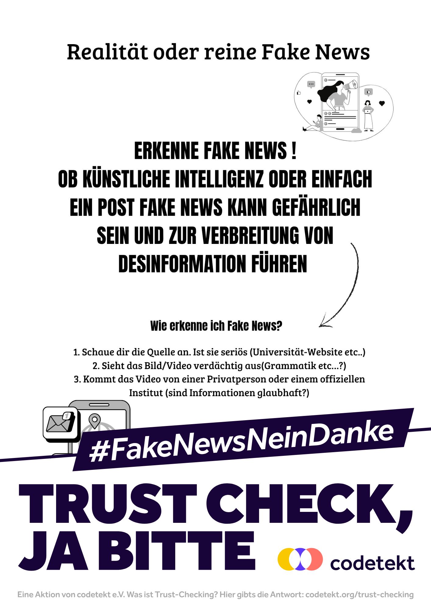 Eure Plakate sind da! Vielen Dank an alle, die ihre Ideen und Motive eingereicht haben! Gemeinsam sind viele unterschiedliche Plakate entstanden, die ein klares Zeichen gegen Desinformation und für Zusammenhalt setzen. Hier könnt ihr die Plakate als PDF zum Ausdrucken oder als Bild (jpg) zum Teilen auf Social Media herunterladen. Macht die Botschaft sichtbar, ob zuhause, im Lieblingscafé oder online. Nutzt unbedingt den Hashtag #FakeNewsNeinDanke, damit eure Aktion Teil der wachsenden Bewegung wird und wir gemeinsam noch mehr Menschen erreichen.